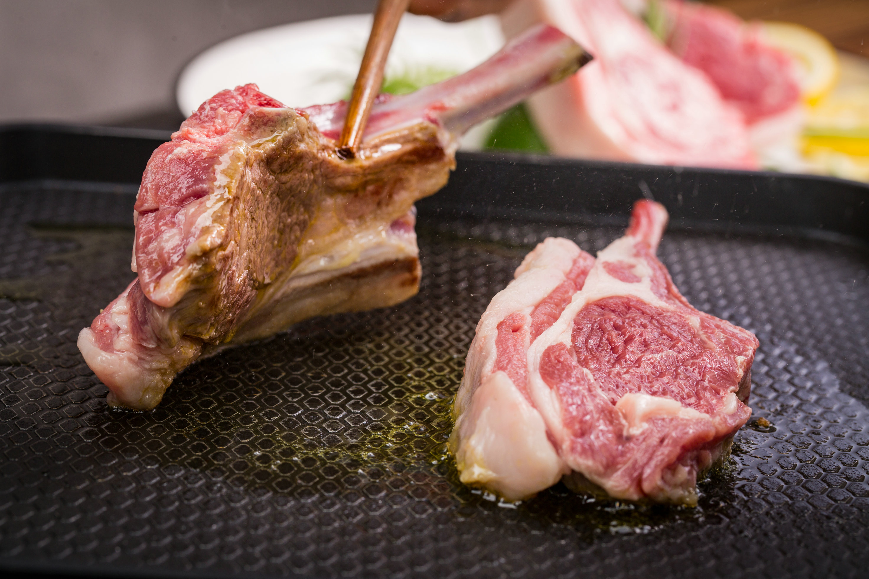 2.中小火預熱烤盤2分鐘,放入羊排,每隔30秒翻轉一次